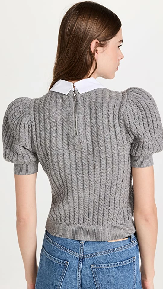 Precise cable-knit patterning adds charming texture to this alice + olivia sweater top, which gains a touch of signature style form a contrast point collar and puff sleeves.