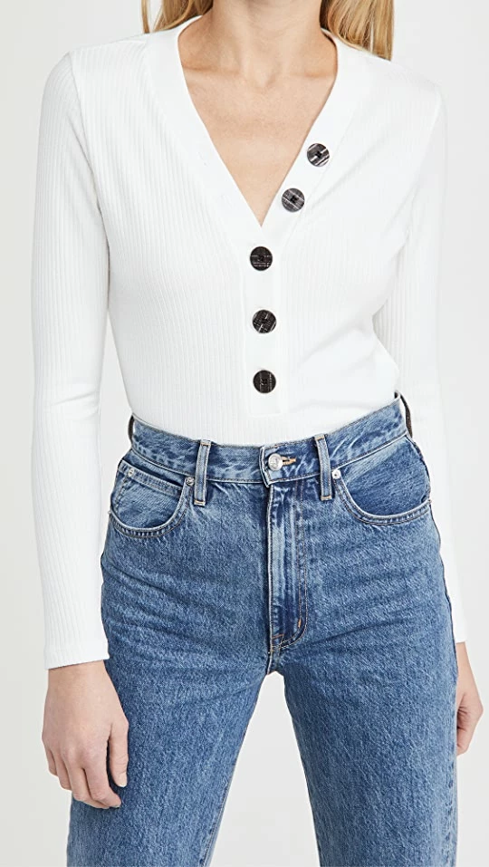 A simple ASKK NY pullover gets an eye-catching makeover, courtesy of a row of oversized buttons and a deep-V neckline.
