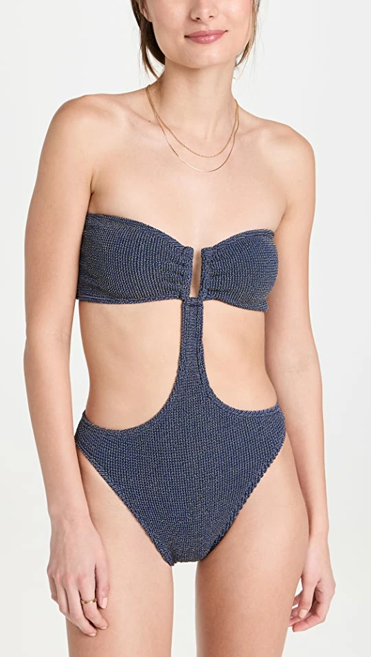 An elegant poolside option, this strapless Bond-eye one-piece swimsuit is designed with a notched bandeau bodice and crafted from the label’s signature crinkly fabric.