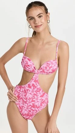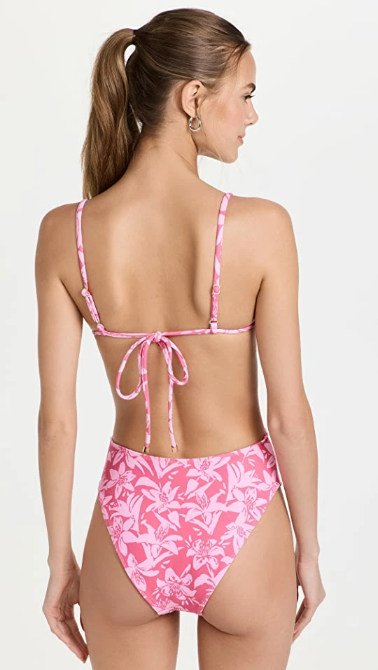 A uniquely shaped one-piece swimsuit from Charlie Holiday, embellished with a pink floral print for a beach-friendly feel.