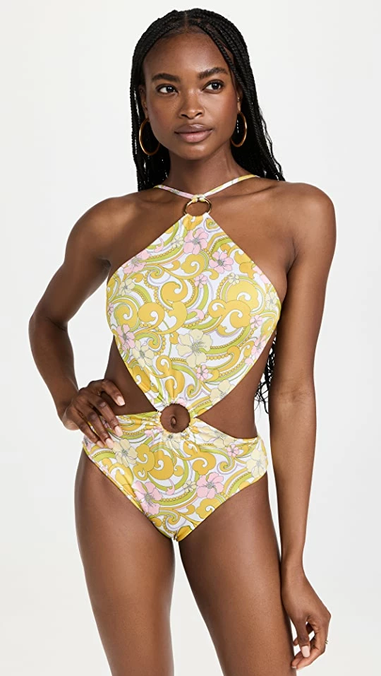 Stylish vintage patterning and metallic rings add a distinct look to this CIN CIN one-piece swimsuit.