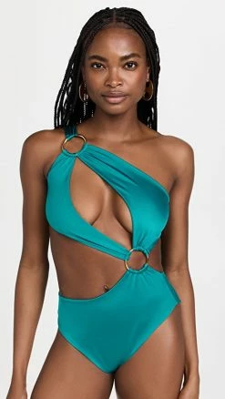 Featuring bold asymmetry, satiny fabric, and a pair of metal rings, this CIN CIN one-piece swimsuit is guaranteed to stand out on your next beach excursion.