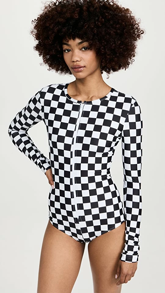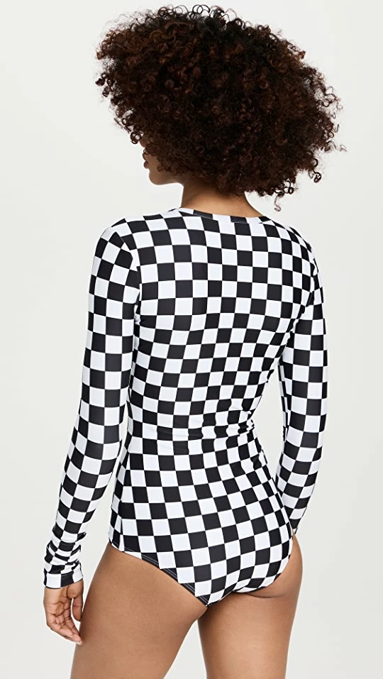 A chic and checkered Cover swimsuit thatโs made to keep up with you whether youโre lounging on the beach or surfing in the sun. This rash-guard style one-piece is crafted in luxurious swim jersey fabric and offers protection from ultraviolet rays in and around water.