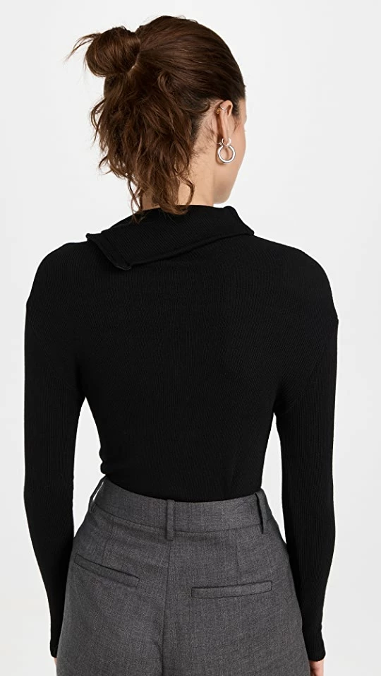 A sophisticated refresh of a slim-fitting ribbed knit style, this Enza Costa sweater takes the classic turtleneck in a different direction with an asymmetrical snap collar.