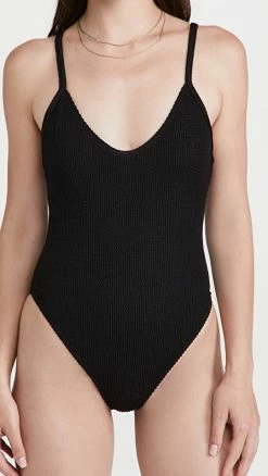 Keep your swim look low-key in this Good American one-piece swimsuit, which features a timeless cut and texture-rich black fabric.