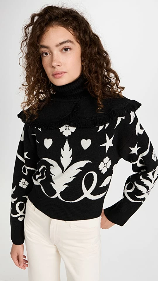 - Turtleneck with fixed collar and loop fringe trim