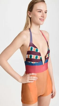 - Plunging neckline with halter tie