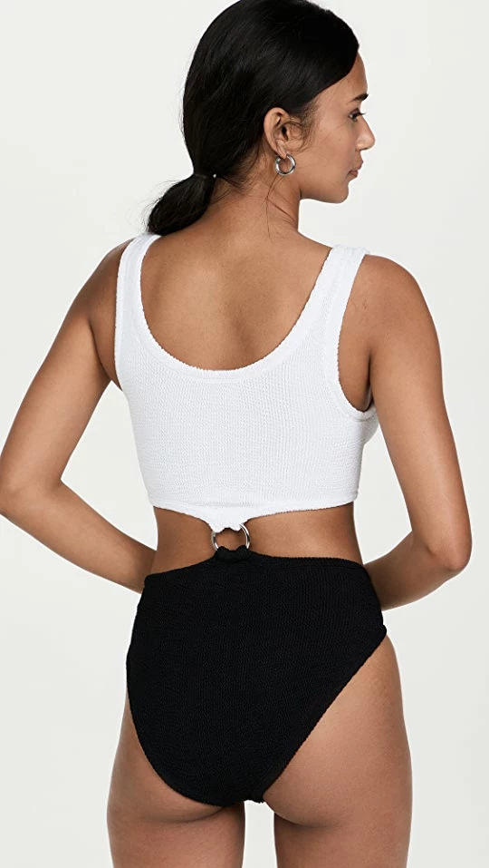 Cutouts, ring hardware, and a two-tone color scheme add a one-of-a-kind look to this crinkly Hunza G one-piece swimsuit.