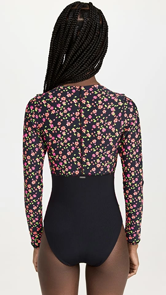 This stylish Maaji reversible rash guard combines 3 distinct floral prints and a muted shade of dark blue. Add a favorite pair of flip flops to complete your on-the-beach look.