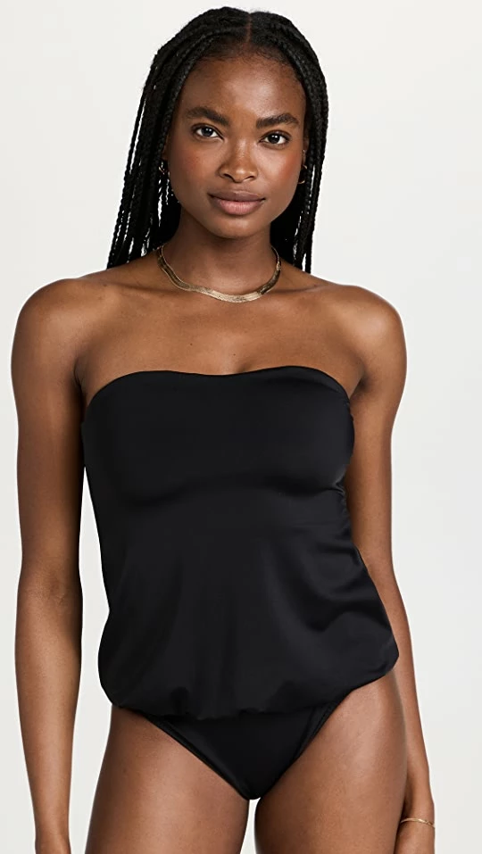 A draped bodice and sweetheart neckline lend a sophisticated look to this strapless Norma Kamali swimsuit.