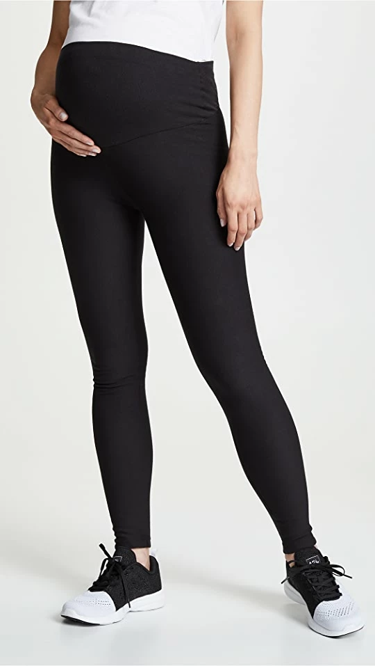 Plush maternity leggings designed with a wide waistband for extra comfort and stretch. Fleece lining provides cozy warmth.