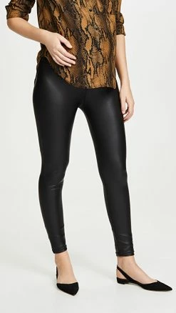 Plush maternity leggings designed with a wide waistband for extra comfort and stretch. A leather-like sheen adds a bold feel to this pair.