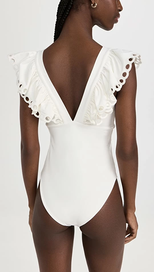 - Cutout ruffle trim with scallop edges