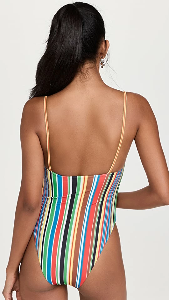 Detailed with a charming mix of multicolor stripes, this Simon Miller one-piece swimsuit is a chic and eye-catching option for your next resort getaway.