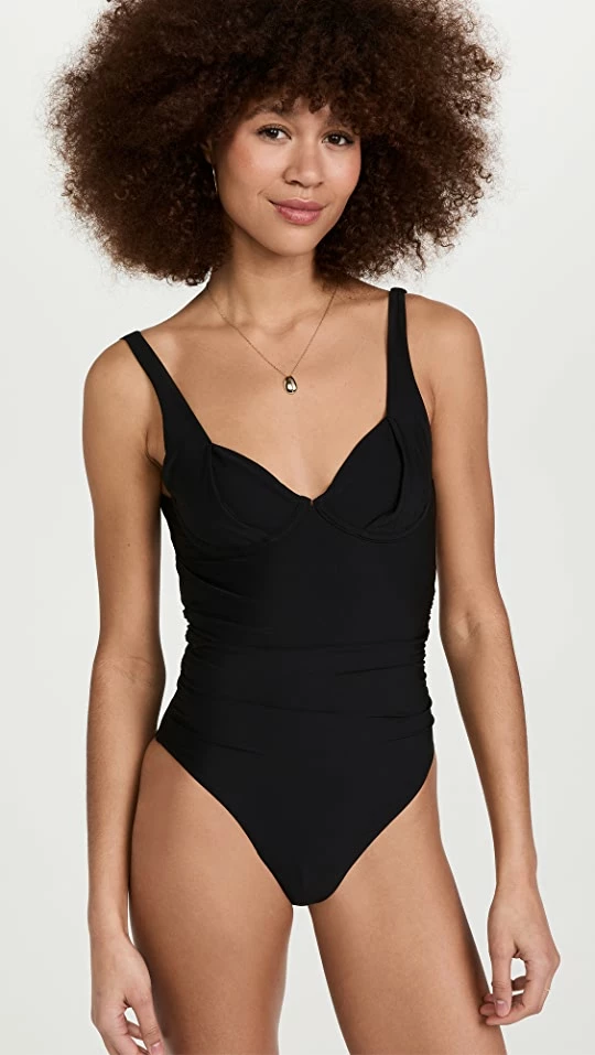 This solido swimsuit updates a classic black one piece with romantic detailing and cutout back for a sophisticated seaside option.