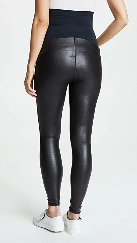 Seamless, maternity leggings from the lingerie innovators at SPANX. The sleek combination of imitation leather and soft jersey yields a streamlined pair of leggings that will add a sexy boost to any look.
