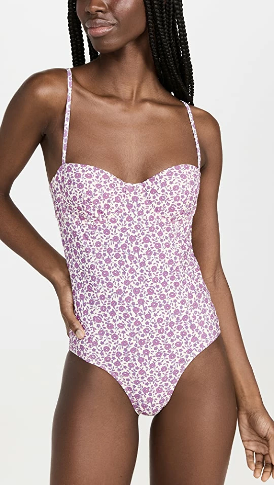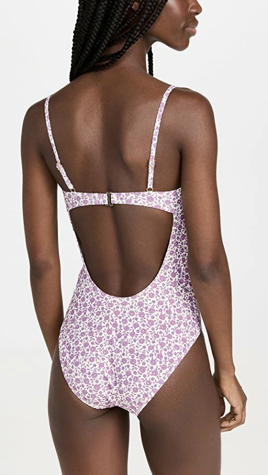 A timelessly pretty option for poolside afternoons, this Tory Burch swimsuit is outfitted with an underwire and accented with a ditsy floral print in a light-purple hue.